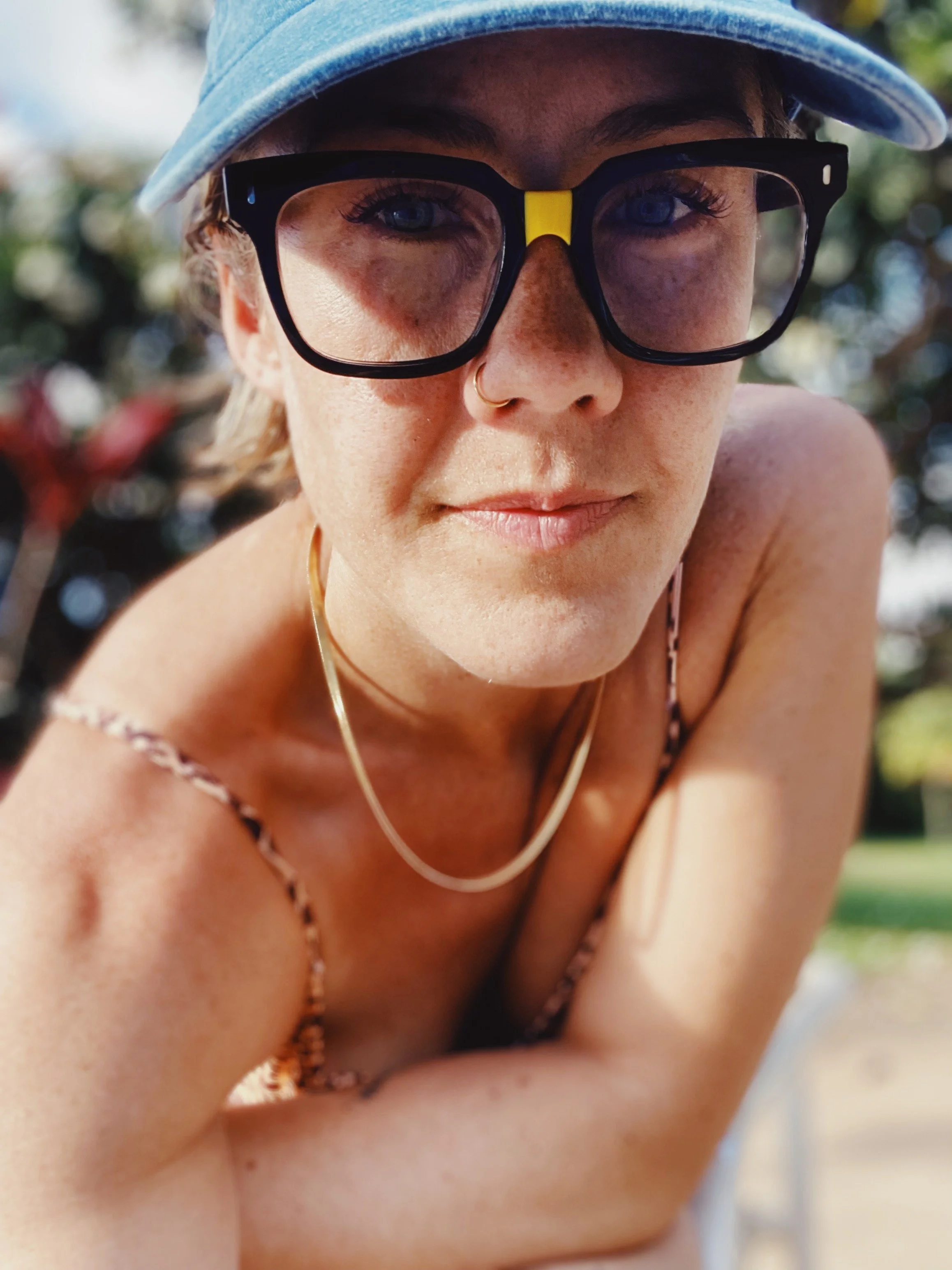 A woman with blonde hair and tattoos on her arm and hand, wearing a black spaghetti strap top and denim shorts, sitting on a wooden floor, with her head turned away and hair covering her face.